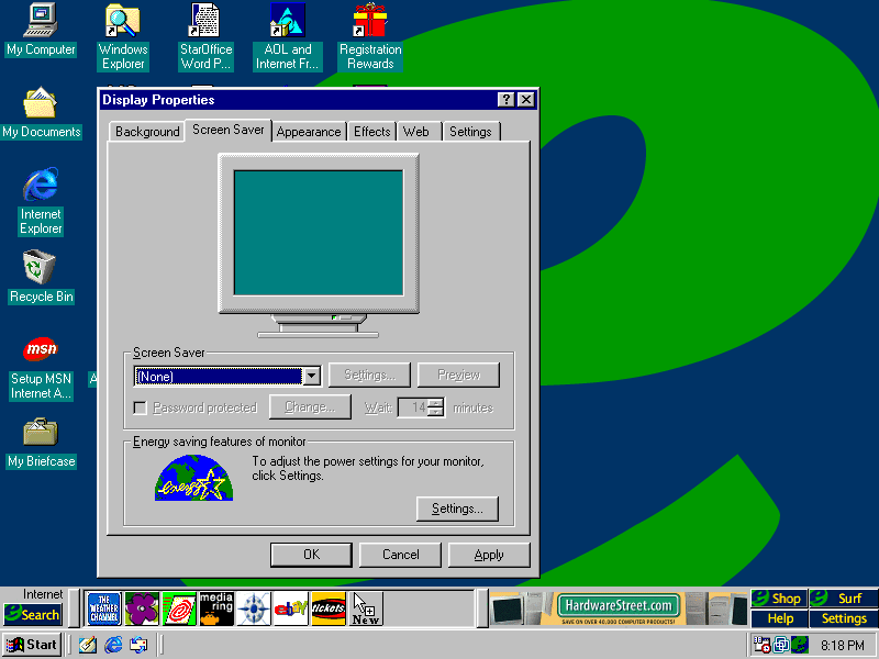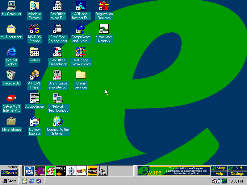 Author: Anonymous Welcome to another OEM review! This review we'll be looking at another eMonster, in this case, the 500a. The 500a sports a Pentium 3 processor clocked at 500 MHz, 64MB of RAM, a 13GB HDD and it comes with Windows 98SE. Let's just get right into it! You get Netscape Communication version 4.6 with this model. We wont be installing it since we have in previous OEM reviews. Let's move onto something else. Who can forget the eWare bar...it's not an eMachines review without one. This one is version 1.2 build 106 which is also bundled with other eMonsters. Moving on... You got the classic ATI DVD Player over here with the 90's vibe, version 3.10 region 1 (presumably North America). Oddly enough, no other eMonster we've reviewed thus far comes with this player so that's unique and interesting. Let's move on! You got your typical keyboard configurator over here. Kinda reminds me of a Windows 3.1 applet tbh. You know...I've never gotten tired of seeing StarOffice on my eMachines installations. It's kind of a staple of them now. This one is version 5.1a...same one as in other eMonsters so not too special. Can't forget WinDAT! This one is version 2.00.54, same one as in other eMonsters so again...not entirely special but still nice to have Kind of sad but these eMonsters really only have minor differences in most circumstances, but still cool to look at. Screensavers and wallpapers are no surprise haha. Thanks for checking out this OEM review and I'll see you in the next one. |