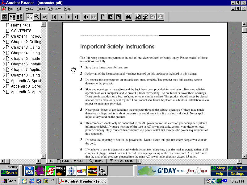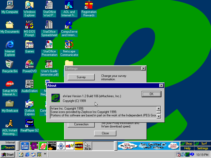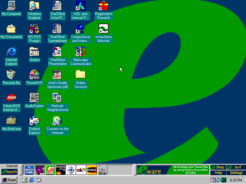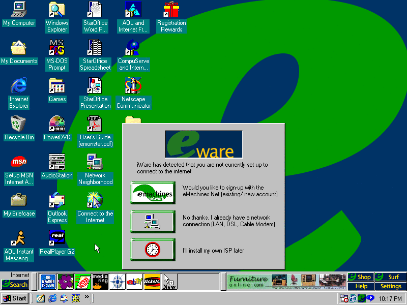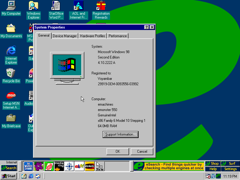 Author: Anonymous This is the desktop for the very special and unique eMachines eMonster 550! The eMonster is a series of computers made by eMachines that were meant for gaming. This particular model happens to come with a default 64MB of RAM (the bare minimum) and kind of shit for what was called a gaming PC along with a 15GB hard drive and finally it comes with an Intel Pentium III that runs at 550MHz. You can tell at first glance that there's a giant fucking toolbar bigger than the size of the Office toolbar or that IE channel bar. That is called an "eWare" toolbar or some shit. It was in the folder with the name so might as well. Now let's checkout the applications of this special PC and then we'll checkout everything else. So this is from the "AudioStation" application. I think its some media player I have no clue but PowerDVD is included so I don't think its that. On a VM or any PC other than its own it will throw that error so it looks like we wont be checking this out. Let's move on. Now this is CyberLink's famed PowerDVD application. You can see its OEM branded which is nice. You can't find that anywhere else. This would be version 2.5 from 1999. Not too sure what this version has but I'm pretty sure editions didn't exist back then unlike now. Since I don't have any movies downloaded (I'm a tech guy not a movie guy lol) we can't really checkout how well it functions so we'll just move on. So...this PC comes with this random shit I've never heard of called StarOffice which apparently was a thing by Sun Microsystems before they died later on. I'm pretty sure its freeware but since I've never heard of it its hard to say. Some research shows that StarOffice still exists today surprisingly...not sure who develops it now though or if its even the same software. You can see all the software that it comes with. Let's move on. Gotta love Adobe...this is some nostalgia. This is Adobe Reader 3.0 (not Acrobat sadly) and seems to mainly be for reading the digital user guide that you can see on the desktop. We'll be checking out the user guide later...it'll give us a chance to explore the application a little bit. Let's move on. You know when you get a new computer you expect everything to already be setup but nope...not in eMachines eyes. Literally that Netscape shortcut on the desktop pulls up an installer that it came bundled with. Since the installer seems original I don't think it has any modifications. We'll install it and see what happens anyway. So...one install and one reboot later and now I got RealPlayer...just what everybody wants...not one...not two but THREE media players like holy shit. eMachines could not get enough of dem media players. They think gamers watch more than they play which defeats the entire purpose of a gaming PC. Let's checkout Netscape now. I have so many questions... No modifications...its just retail. I thought it would be tbh. Let's continue though. For the record we're not checking out RealPlayer since I didn't even know Netscape had it. Who knew the "e-machines network" was this basic. If it actually lets me login or signup I'll laugh. It needed a modem so it didn't work. It also removed the shortcut from the desktop for some reason. Click "Registration Rewards" and it tries to connect to some shit on "myregistration.com" which looks to not even exist anymore. Let's continue and yes that is a beer ad you see. Click one of the buttons on the toolbar and you'll get a dialog like this. I know at least 2 of those sites still exist...those 2 sites being eBay and The Weather Channel. When 90s-era tech can't connect to today's sites. R.I.P. In case your curious the toolbar's version is 1.2 from 1999 and apparently its made by a company called iWare. Seems like a rebranding and that's all. That's probably what it is. This is the final application we're checking out before moving onto another topic. We're back on Adobe Reader to checkout some of its features while reading this PCs user guide. Might I say this is actually a perk I like about eMachines. No other OEMs included digital user guides back then. As you can see you can zoom in and out with that magnifying glass on the bottom right on top of the "Tickets" button. Let's see what else this thing can do. This feature is everywhere. Not really special but nice that it existed in the 90's. I don't call Adobe having this. Chrome's integrated reader definitely doesn't but I don't think Adobe Reader nowadays does. That's sad. That's done and now we're gonna checkout wallpapers and screensavers. In the wallpapers section you got Emachine (the one set by default), E, Ewall and Ewalls. E is basically Windows98 but with eMachines logos in the middle and the wall and walls kind of speak for themselves. I like the one set by default the most. No OEM screensavers sadly but there usually never is. Now we're heading onto the last part of this review and it is unique to the eMonster series of PCs...GAMES! We'll be trying out DOOM and DOOM II. DOOM II runs flawless on it despite it only having 64MB of RAM. Probably only DOS games work this good. DOOM I runs just as well (this is the full version btw ignore the "Read This!" thing). Funnily enough this PC could run Microsoft Flight Simulator 98 according to those requirements. I guess 64MB was...alright for the time but I mean it was literally the bare minimum for 98 and all the other OEMs were offering at least 128. Well...that's the end of this very special OEM review. We'll see you on the next one. |