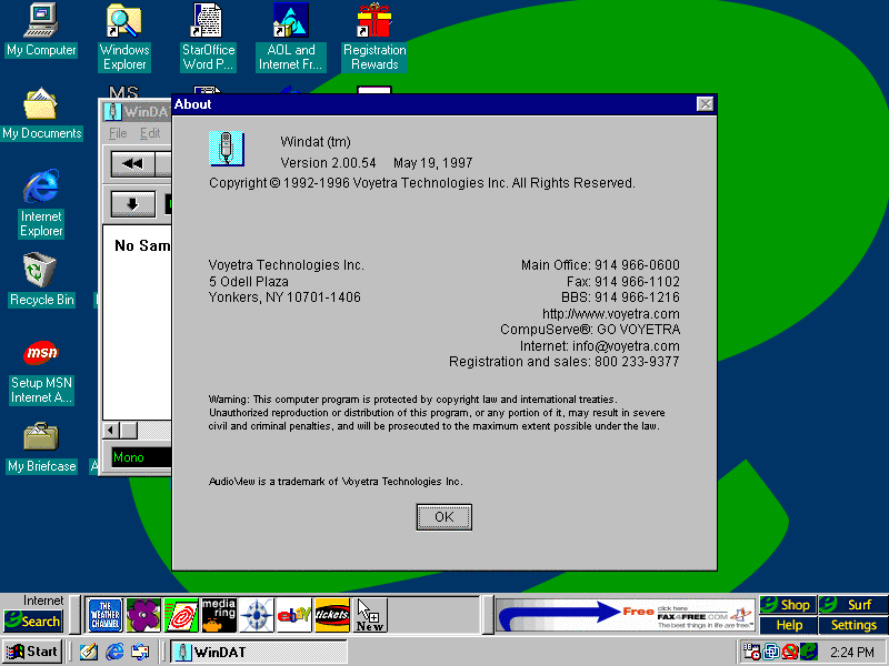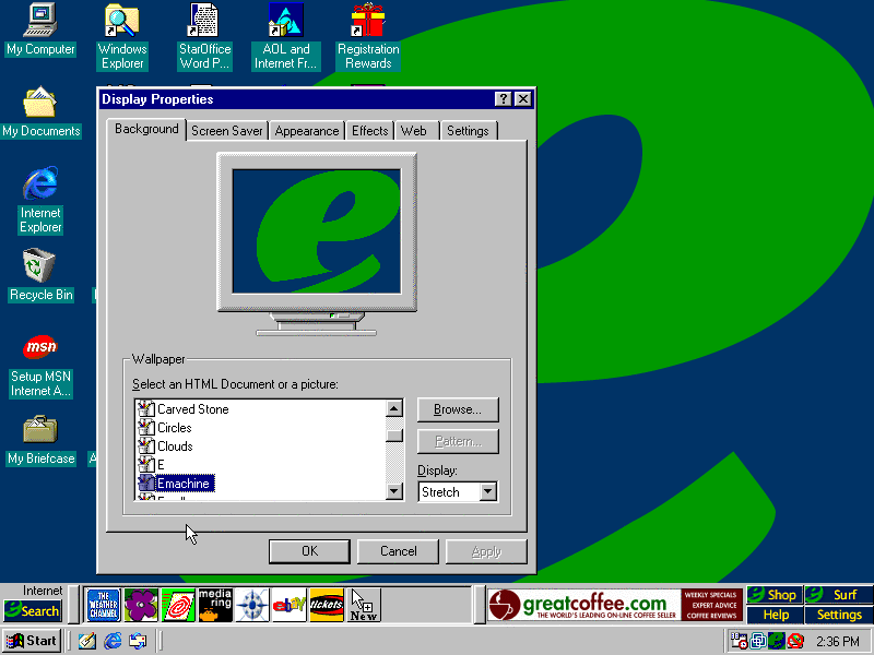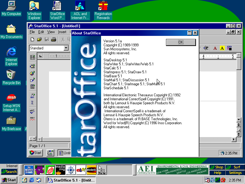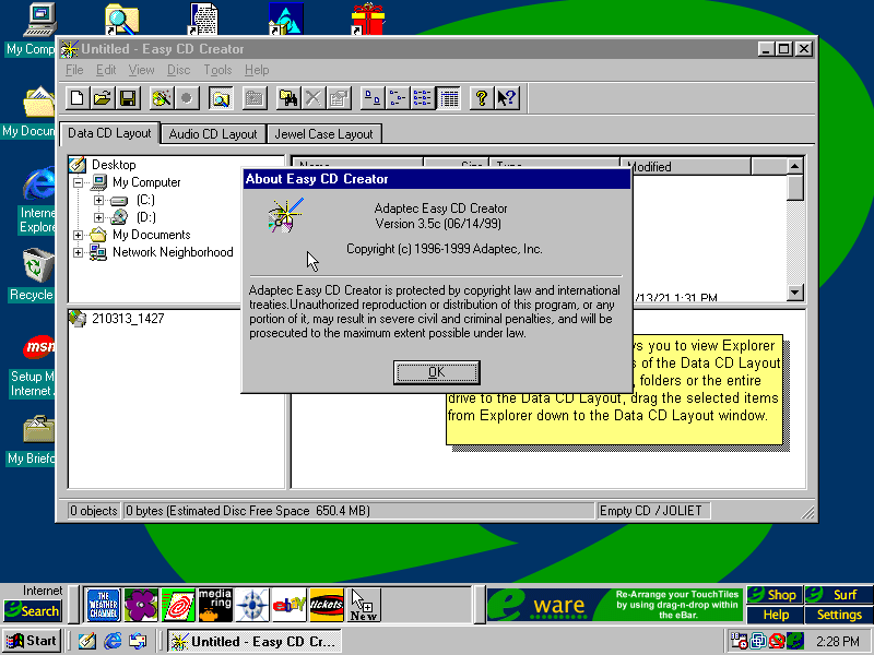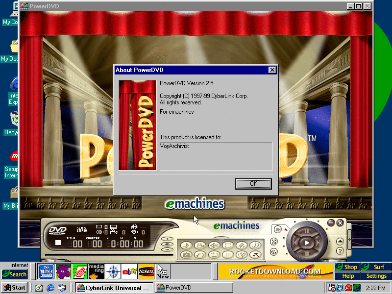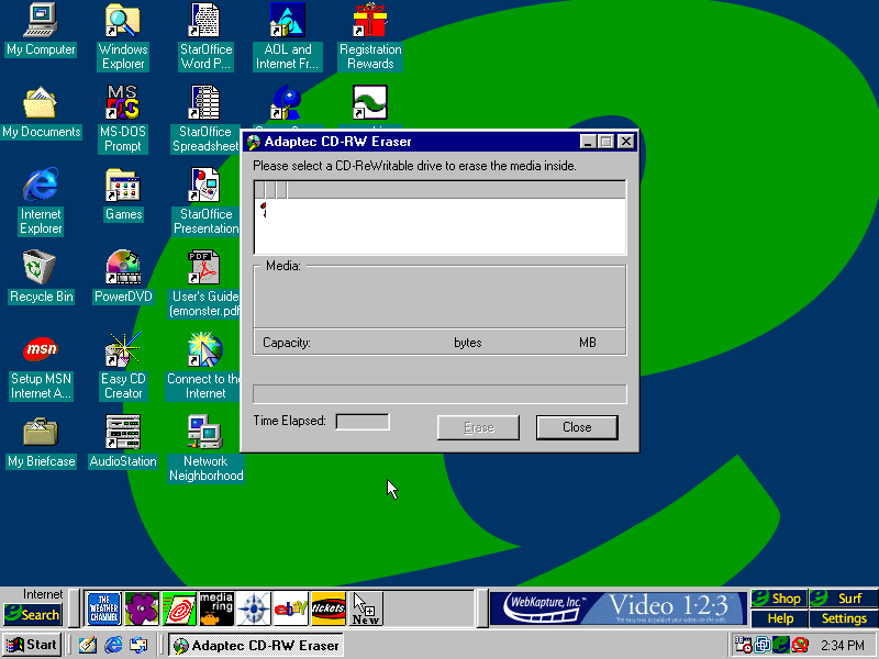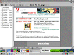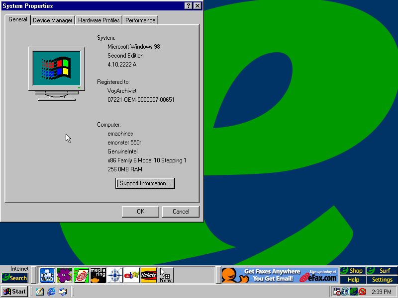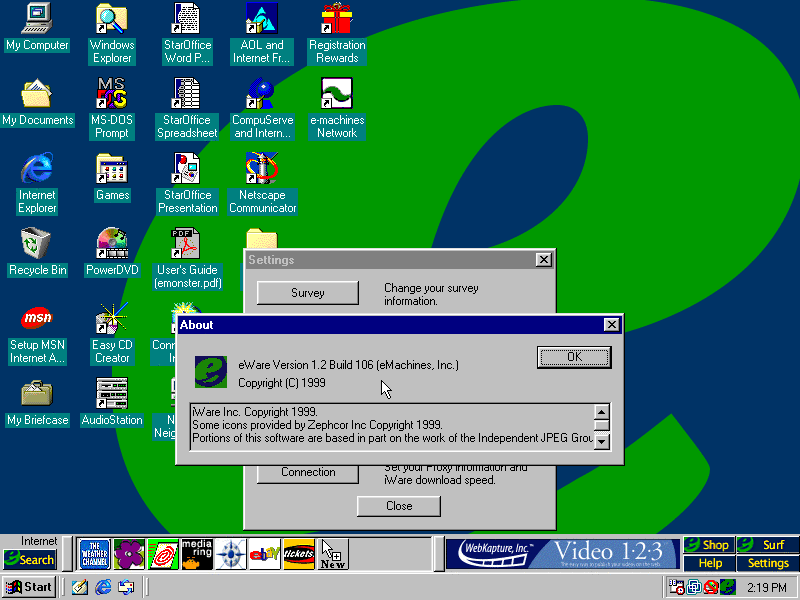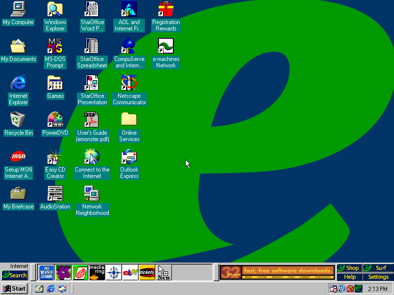 Author: Anonymous Its yet another eMonster! Welcome to another special OEM review. This is is the desktop for the eMachines eMonster 550r. It comes with Windows 98 SE, an Intel Pentium 3 550 processor, 64MB of RAM and a 15GB HDD. The desktop doesn't look half different from other eMonster's we've reviewed. Compared to the 800 though which came with Windows ME, it's a lot different. The application selection on the desktop for both the 550r and the 600 are not that different, they're mostly alike. Anyways, with all that information digested and out of the way let's dig in. So first we're looking at the version of the infamous eWare Toolbar. This is version 1.2 build 106. Same exact version as in the 600 actually. PowerDVD version seems to be the same too. I wonder why its so similar. This version is the same too. I'm seeing a pattern here. You know one thing I noticed. The StarOffice document isn't on the desktop on this one but it is on the 600. So there are still minor differences. Adobe version is the same though. Now here's one of the major differences. The eMonster 600 never had this. The 550r on the other hand, does. Its basically a Nero burner but from another company and possibly before Nero existed (I have no clue when they were founded). Its called Adaptec Easy CD Creator and is version 3.5c. It also has a separate application named CD Copier Deluxe but it doesn't work in this VM since apparently there are no supported CD recorders so it just closes after showing the dialog. Here's another Adaptec program named DirectCD. This is version 2.5d. It has the same compile/release date funnily enough. It frankly seems like it does the same thing as the Easy CD Creator. This came with DirectCD as well, its a CD-RW eraser. Seems nice, kind of basic though. This model also comes with version 5.1a of Sun Microsystems StarOffice. This is the exact same version that came with the 600. Still nice I guess. I know this review seemed kind of off since we didn't check this but don't worry, I didn't forget. Its basically the same selection as most other eMachines PC's of the time. No custom screensavers as well. Ah good old Netscape. No computer of the 90's would be normal without this. It comes with version 4.61. Not going to install it though. Well that's all for this special OEM review and I'll see you in the next one |