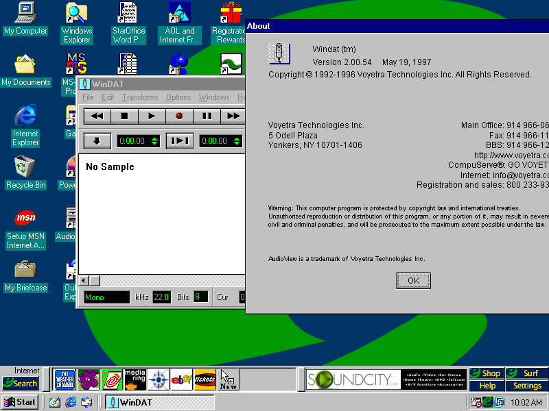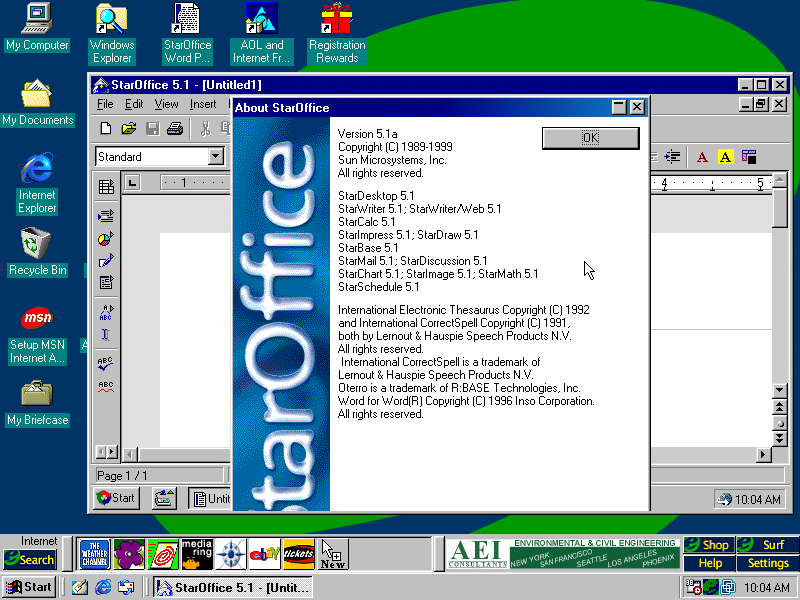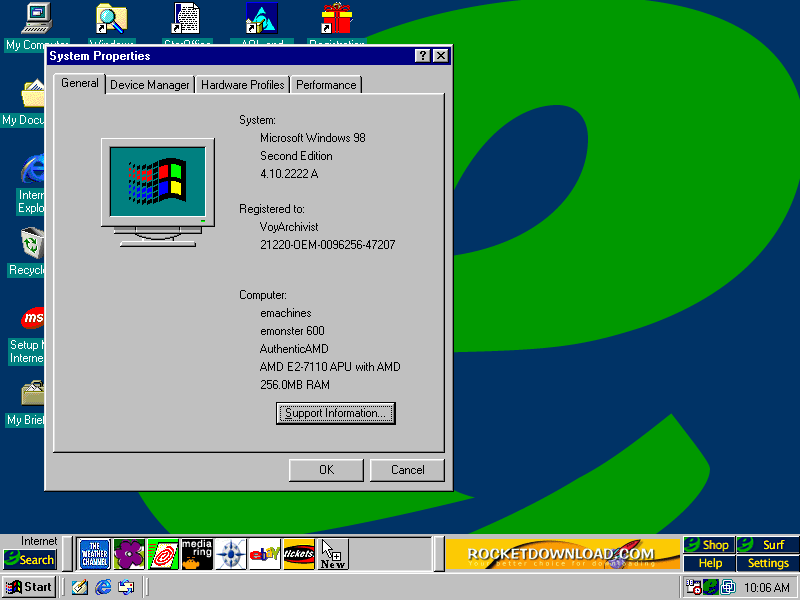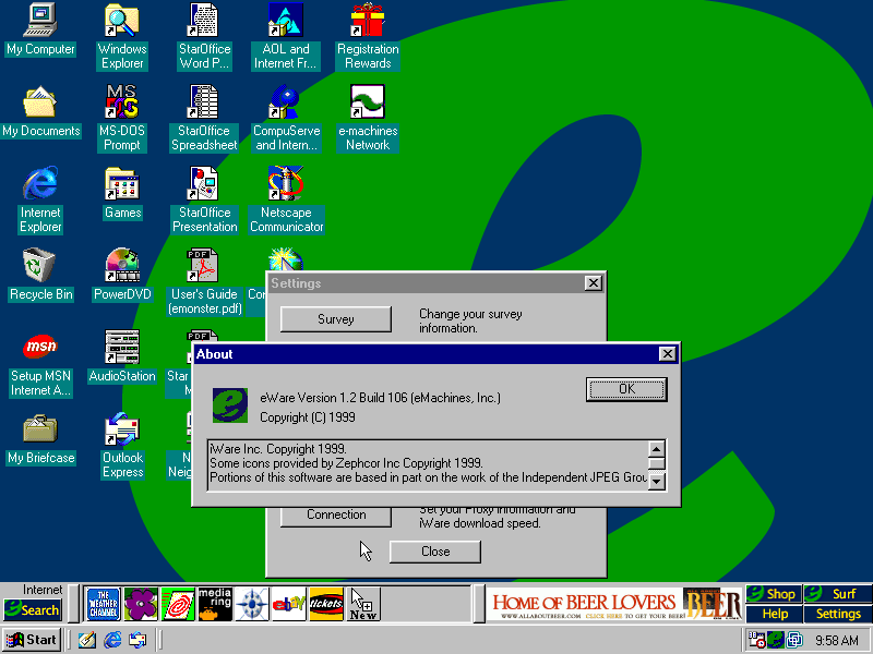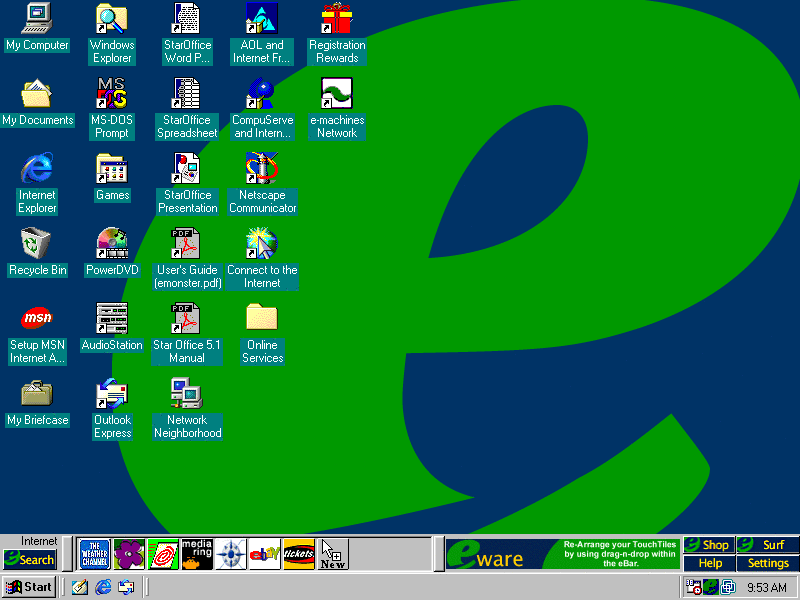 Author: Anonymous This is the desktop for the eMachines eMonster 600. It sports a Pentium 3 processor clocked at 600MHz, 64MB of RAM (this VM has 256) and a max supported RAM amount of 256MB. Along with all that it also has a 20GB hard drive. It comes with Windows 98 SE. Now let's dig in. Now as usual in the 90's you have this big E wallpaper which is actually similar to another one seen in the Windows 7 era many years later except that one was 3D. You got E, Emachines (default), Ewall and Ewalls which are all the same across all of the eMachines PCs of the 90's no matter the model (at least at this time). Screensavers? Same thing! No screensavers which is typical. OEMs didn't really like to make their own screensavers. Compaq did for a time but it wasn't a long time and Acer somewhat did in the XP era but not really much further. So first we're checking out Cyberlink PowerDVD which still exists today. The eMonster 600 comes with PowerDVD version 2.5 which is also OEM branded. And as you could see in every picture thus far this eMonster comes with the infamous toolbar seen in many eMachines PCs of the time. This one has version 1.2 build 106. Now typically in the 90's eMachines ALWAYS bundled Adobe Acrobat Reader and this time is no exception with version 3.01 being pre-installed for the express purpose of the 2 PDF files on the desktop. So I never noticed this but the AudioStation software which you saw in previous reviews wont work in a VM has some additional software and this is one of them. It looks to be some sort of music player meant to replace Windows Media Player (but bundled with Crystal sound cards or some shit). This is version 2.00.54. Wouldn't be eMachines without cheap replacements to popular paid software. This is Sun Microsystems StarOffice version 5.1a and it comes pre-installed. It seems not many OEMs bundled it and would've rather bundled some Microsoft Office software which makes sense iirc. Always odd when OEMs bundle setup executables instead of just the actual installed application and ESPECIALLY when they put a shortcut to it on the desktop. We wont install it but at least now you know it existed lol. Well that's all for this special OEM review and I'll see you in the next one |