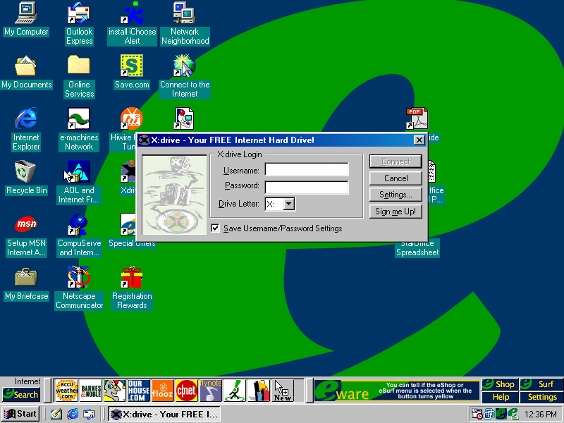 What really caught my eye was this shortcut called Xdrive. When we open it we get this login prompt. The title bar says "X: drive - Your FREE Internet Hard Drive". By the sounds of it this seems like the first entry into cloud storage. Who knew it even existed back in the 90's. The domain looks to no longer exist and there's no history of Xdrive anywhere on the internet. Not even on Wikipedia. That's sad. Moving on... (PNG)