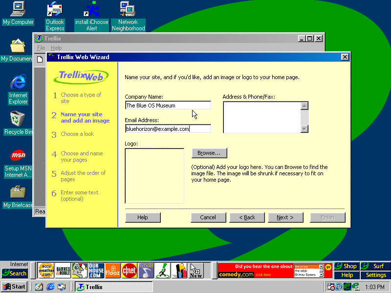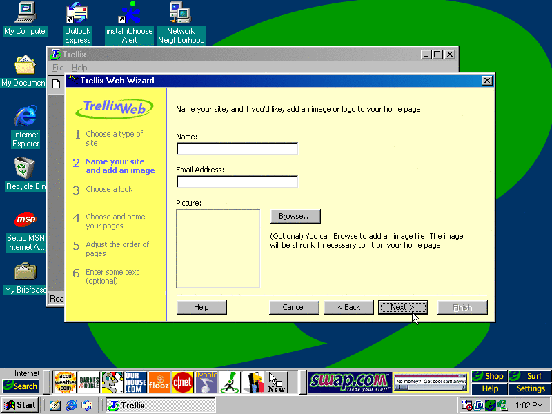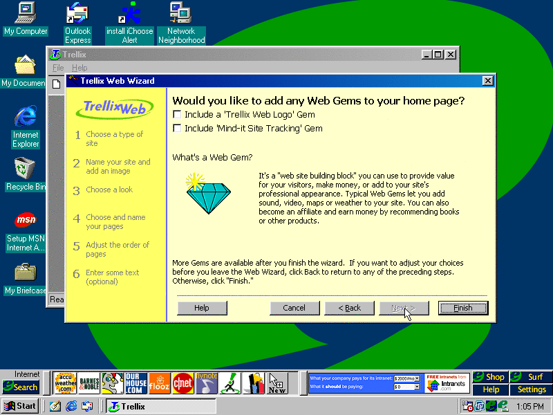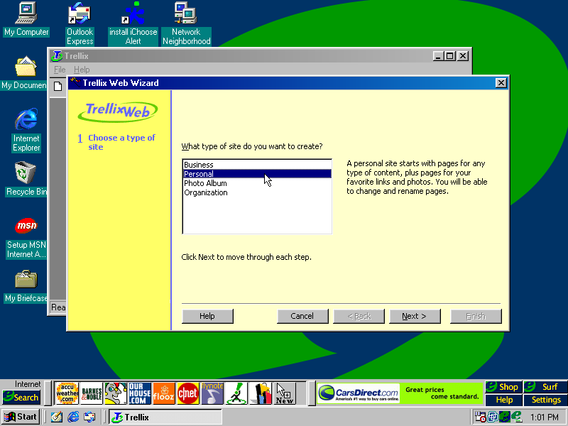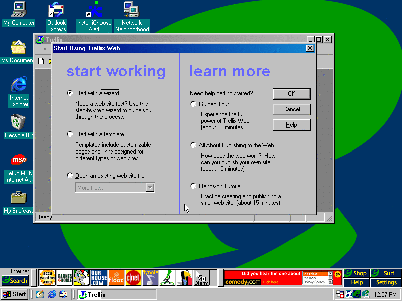 The default one selected which is start with a wizard was chosen. The wizard doesn't look half bad...we're gonna create a 90's personal website. (PNG)