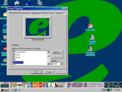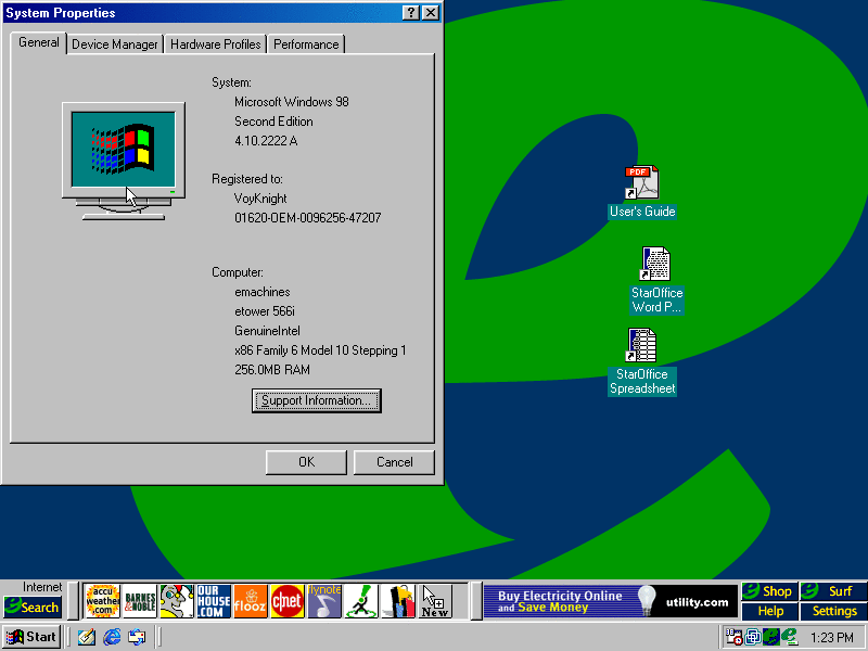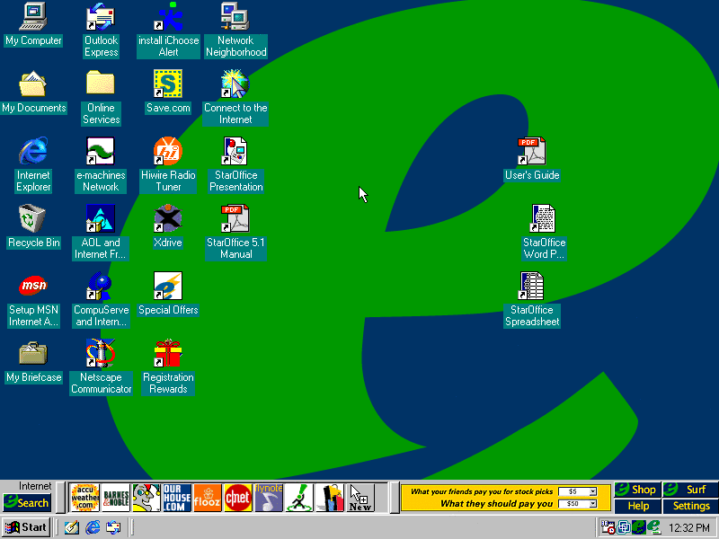 Welcome to another OEM review! Today we're reviewing the eMachines eTower 566i. This PC comes with Windows 98 SE, an Intel Celeron clocked at 566MHz, 32MB of RAM and finally to top it off a 7.5GB HDD. This is the desktop of course. You can see some things like moved shortcuts for some reason...the eMachines bar on the bottom by the taskbar and some shortcuts that are ads. Let's get started. (PNG)