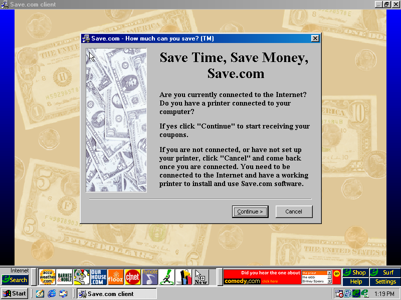 Oh boy...an advert in an installation wizard. I thought those only came years later somewhere in the 2000's (probably the XP era). This is the Save.com shortcut...I was curious. Not installing it though. (PNG)